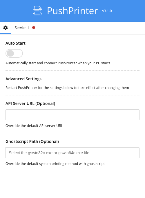 Open PushPrinter, in the first tab at the bottom, press the field "Ghostscript Path". Navigate to your installation folder. Inside, there will be another folder called "bin". Open that and select either "gswin32c.exe" or "gswin64c.exe"